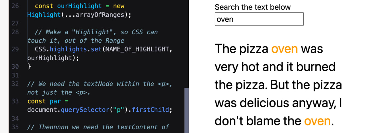 Using the Custom Highlight API — The CSS Custom Highlight API offers a way to style text ranges on a document using JavaScript to create the ranges, and CSS to style them. And, as of Firefox 140, all major browsers now support it. This could be great for in-page search or even dynamic syntax highlighting.
